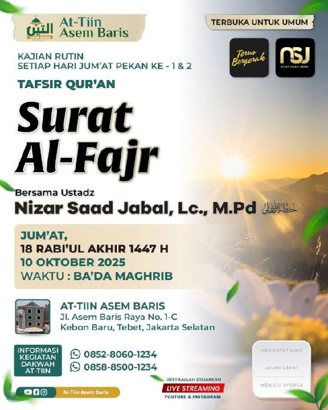 Terbuka untuk umum, mari hadiri majelis ilmu dan renungkan makna agung dari Surat Al-Fajr, tentang fajar kehidupan dan ujian keimanan.