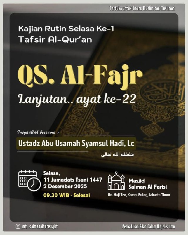 Dengan mengharap ridho Allah 'azza wa jalla, hadirilah kajian rutin 𝐓𝐚𝐟𝐬𝐢𝐫 𝐀𝐥𝐪𝐮𝐫𝐚𝐧 terbuka untuk umum.. Insyaallah :