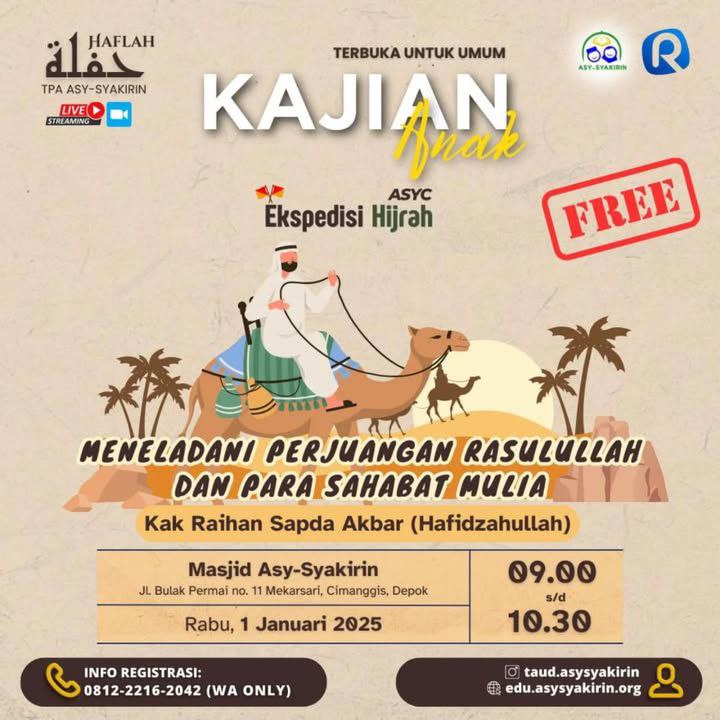 KAJIAN ANAK TPA ASY-SYAKIRIN yang mengusung tema "EKSPEDISI HIJRAH : Meneladani Perjuangan Rasulullah dan Para Sahabat Mulia"* agenda ini insyaaAllah akan dilaksanakan pada:
