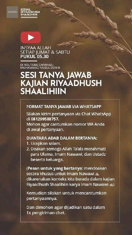 Insya Allah Sesi Tanya Jawab Setiap Jumat & Sabtu, Pukul 5:30 WIB bersama Ustadz Muhammad Nuzul Dzikri -hafizhahullah- di:
