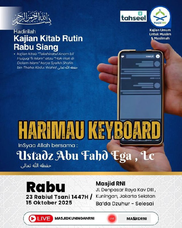 Dengan mengharap ridho Allah โazza wa jalla, hadirilah Kajian Kitab Tabshiratul Anam bil Huquqi fil Islamโ atau โHak-Hak di Dalam Islamโ karya Syaikh Shalih bin Thaha Abdul Wahid ุญูุธู ุงููู ุชุนุงูู rutin terbuka untuk umum.. InSyaa Allah :