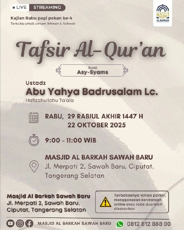 Insyaa Allah DKM Masjid Al Barkah Sawah Baru akan menyelenggarakan Kajian Islam Ilmiah untuk UMUM, Insyaa Allah akan dilaksanakan pada :