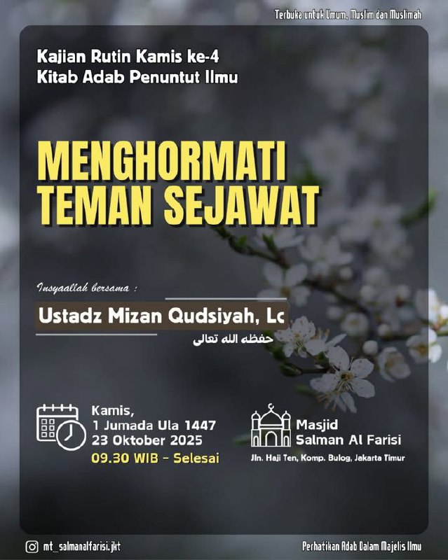 Dengan mengharap ridho Allah 'azza wa jalla, hadirilah kajian rutin bulanan terbuka untuk umum.. Insyaallah :