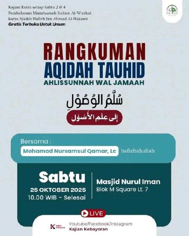 📺: Kajian ini juga dapat disaksikan live streaming di Facebook, Youtube dan Instagram Masjid Nurul Iman Blok M Square