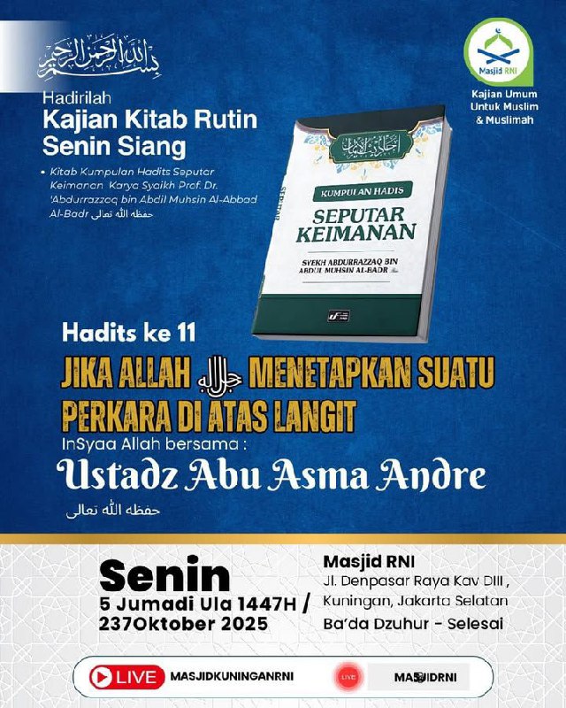 Dengan mengharap ridho Allah โazza wa jalla, hadirilah Kajian Islam Ilmiah rutin terbuka untuk umum.. Insyaallah :