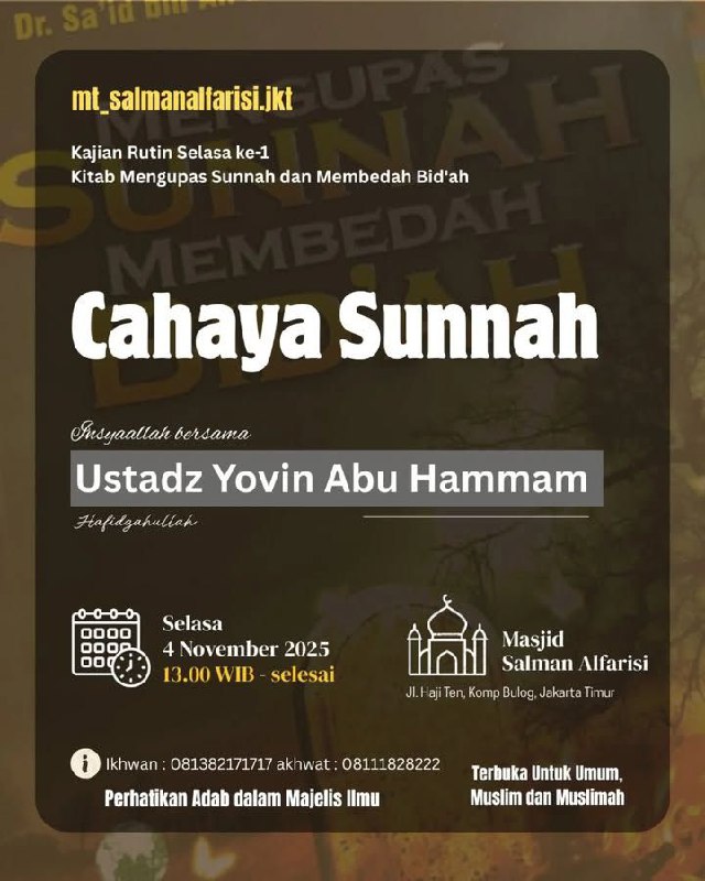 Dengan mengharap ridho Allah 'azza wa jalla, hadirilah kajian rutin terbuka untuk umum. Insyaallah :