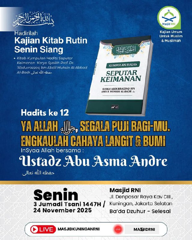 Dengan mengharap ridho Allah โazza wa jalla, hadirilah Kajian Islam Ilmiah rutin terbuka untuk umum.. Insyaallah :