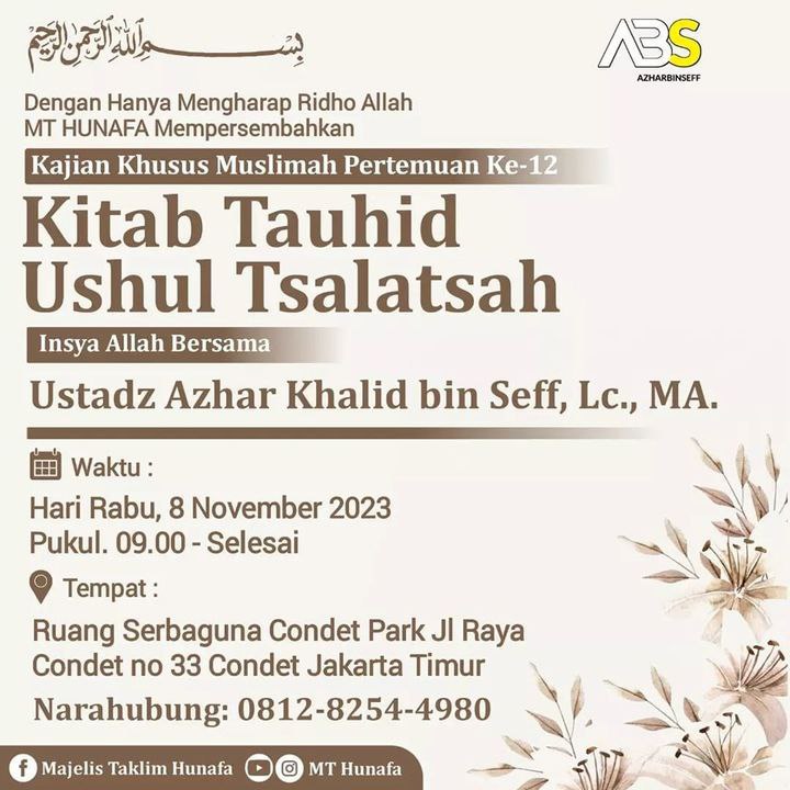 Hadirilah kajian rutin *MT Hunafa* terbuka untuk umum Khusus Muslimah, in syaa Allah bersama:
