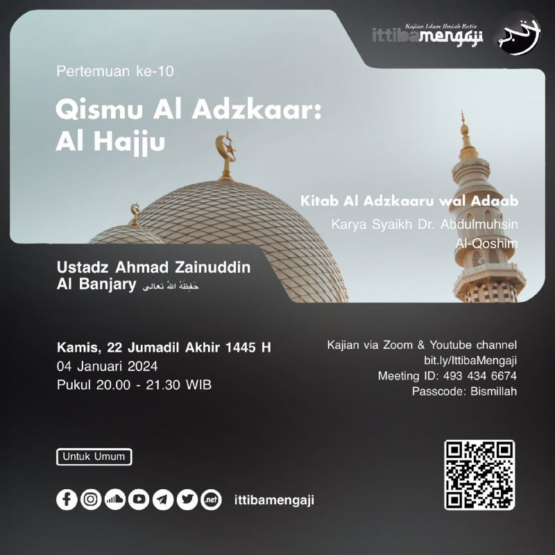 ▶️ Kajian akan diadakan via Zoom dan Youtube channel IttibaMengaji (scan QR code diposter).