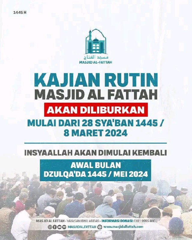 Informasi kajian rutin pekanan Masjid Al Fattah mulai malam ini ( Jum'at 8 Maret 2024 ) DILIBURKAN dan InsyaAllah akan dimulai kembali Awal Bulan Dzulqa'da 1445 H / Mei 2024