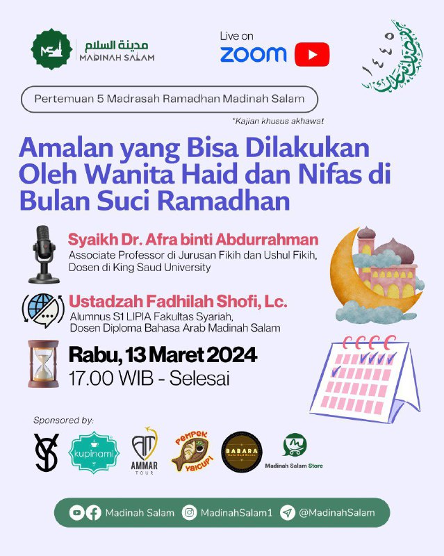 Mari belajar di bulan Ramadhan bersama Masyayikh dan Syaikhah dari Saudi Arabia di Madinah Salam disertai dengan penerjemah.