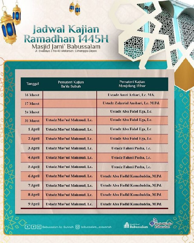 Berikut Jadwal Kajian Masjid Jami' Babussalam Ramadhan 1445 H