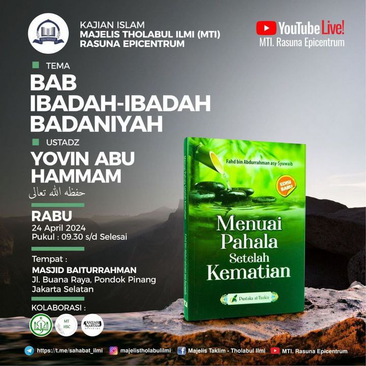 Kami mengundang saudara saudari muslim muslimah untuk hadir pada kajian kitab *Menuai Pahala setelah Kematian* _dari Syeikh Fahd bin Abdurrahman asy Syuwaib_ yang akan dilaksanakan pada: